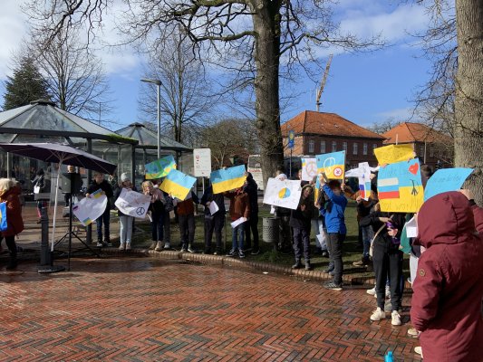Am 24. Februar fand auf dem Friedeburger Marktplatz eine Mahnwache statt „für den Frieden, gegen den Krieg in aller Welt, am Beispiel Ukraine“, organisiert von der Friedeburger Willkommensgruppe „Fremde brauchen Freunde“ und der Kirchengemeinde. Die Klassen 10b, 6Ra und 6Rb vertraten mit ihrer Anwesenheit die Schule Altes Amt Friedeburg und zeigten ihre Solidarität mit eindrucksvoll und kreativ gestalteten Plakaten und Bettlaken. Frau Thurm von der Willkommensgruppe und der Friedeburger Bürgermeister Helfried Götz hielten kurze Reden, der Pastor Jörg Janköster sprach ein Friedensgebet, Ukrainische Frauen sangen ein Friedenslied, die ukrainische Schülerin Vlada spielte Geige und zum Schluss sangen alle zusammen „We shall overcome“. Auch das Wetter spielte sinnbildlich mit: Zuerst regnete es aus dunklen Wolken, dann tat sich der Himmel auf und die Sonne kam durch mit einem Regenbogen als Hoffnungszeichen. Es war eine gute Veranstaltung!